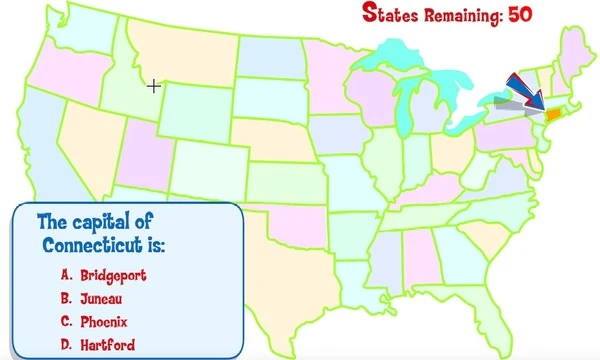 When you play, you'll see a big map on your screen with lots of states. In each round, an arrow will pop up and point to one state, and a question will appear! You will have to use your mouse to choose one answer from the four options you'll see. Click on what you think is right!