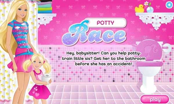 Play the Barbie: Potty Race game and become a babysitter for the day! Complete the sister's potty training and do your best to avoid any distractions!