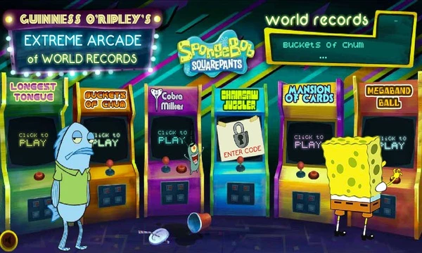 Meet SpongeBob SquarePants and his friends to have loads of fun in the Extreme Arcade of World Records game. Patrick, Sandy, Squidward, Gary, and Plankton prepared many retro-style arcade games. Can you join them and check out what each one has in store for you?