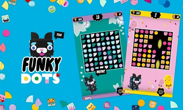 The game consists of 5 levels of increasing difficulty. Can you believe that an adorable LEGO cat is hosting? Moreover, each stage of this challenge features a different color palette for the Funky Dots. The themes are mermaid, ice cream, adventure, and monster.