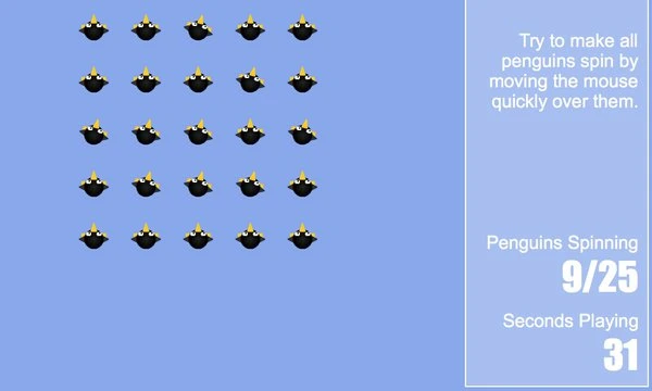 Play Penguin Spinner game and help the penguins make pirouettes all at the same time. Try to push them with your cursor to make them move in circles!