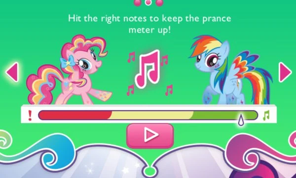 Make sure you hit the right notes and do not miss any of the shapes. Only like this, you will keep the prance meter up. Always keep it in the green area for an excellent result. If you reach the dangerous red zone, you will not gain too many points in the end. Keep up with the good work until the end of the song. The colorful rainbow bars will tell you how much of the song you have left.