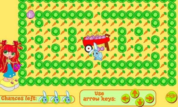 You have to hurry because the cute pet is starving! Once you are inside the labyrinth, you can use the Arrow keys to move the rabbit around. Hold the Left, Right, Up, and Down arrows as you need, and collect the veggies until there are no more to be found! That doesn't sound too difficult, right?